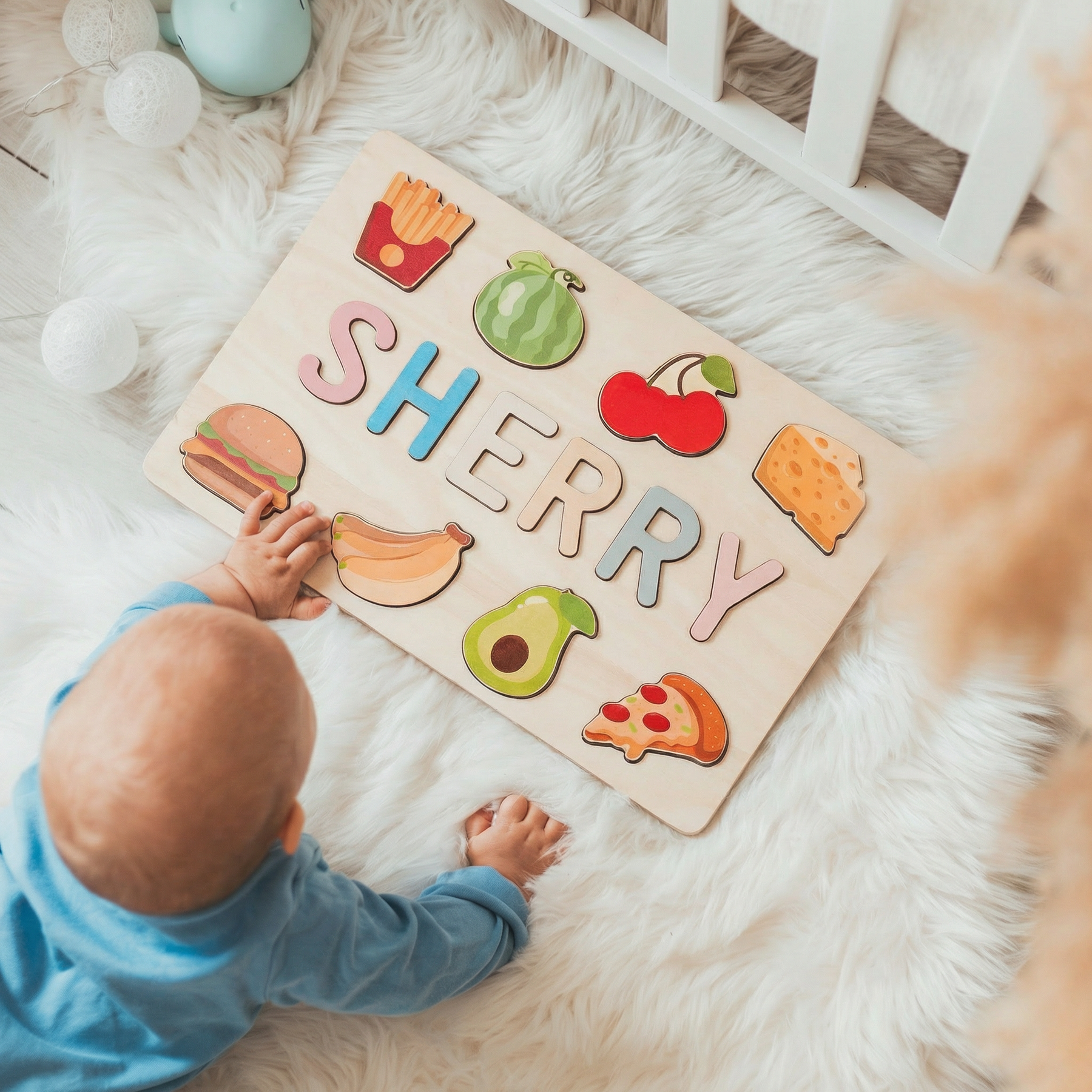 Personalisiertes Baby-Namenspuzzle aus Holz mit Essen