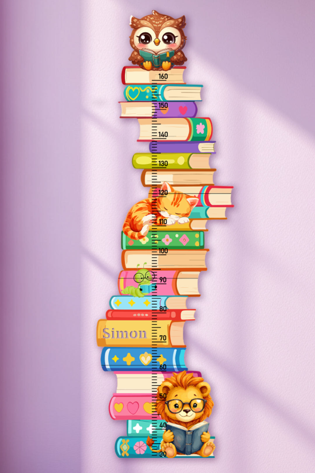 Watch your little one's growth soar with our adorable Personalized Wooden Bookstack Growth Chart. Perfect for nurseries, playrooms, or bedrooms, this charming height chart features a stack of colorful books adorned with sweet animal characters – an owl, a cat, a lion, and more – all playfully measuring your child's height.