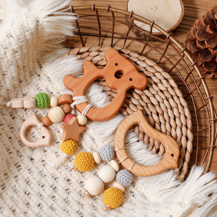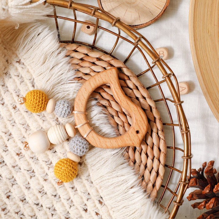 - Mounted on quality beech wood teether ring, smooth and comfortable to touch and explore