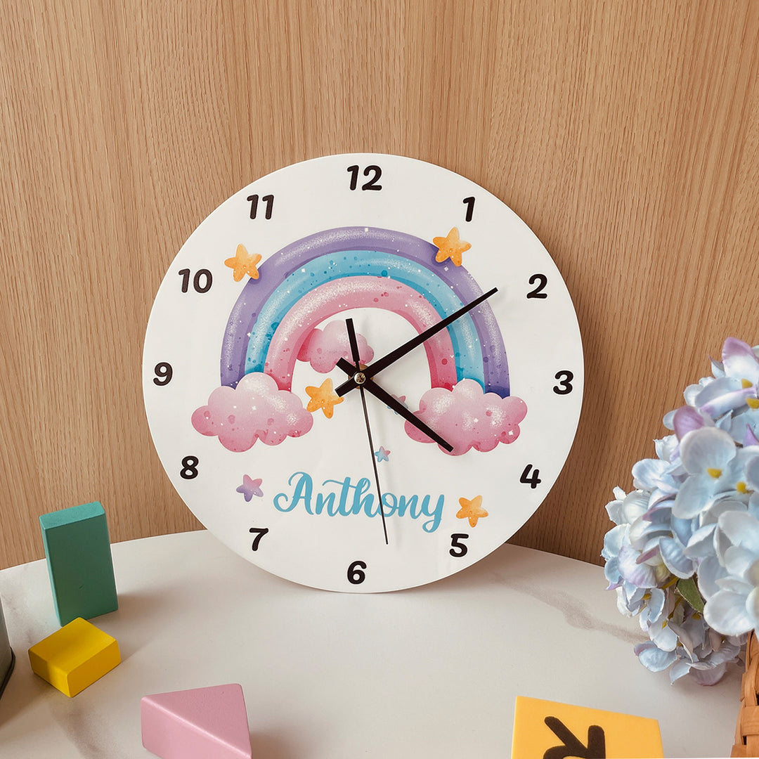 Your child will absolutely love this personalized clock - specially made just for them (or if they share a room we can add a name on each side of the rainbow)! Not only will they look forward to learning to tell the time they will also get to see their own name each day hung on the wall.