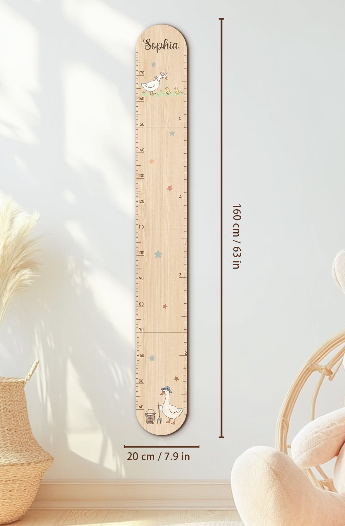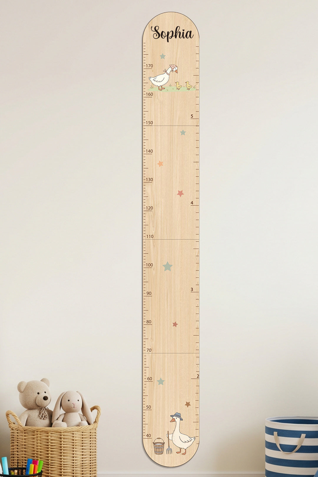 Celebrate every stage of your child’s growth with this personalized wooden height chart, beautifully designed with a charming goose family theme. With its soft natural wood finish and heartwarming illustrations, it adds warmth, personality, and meaning to any nursery or kids’ room.