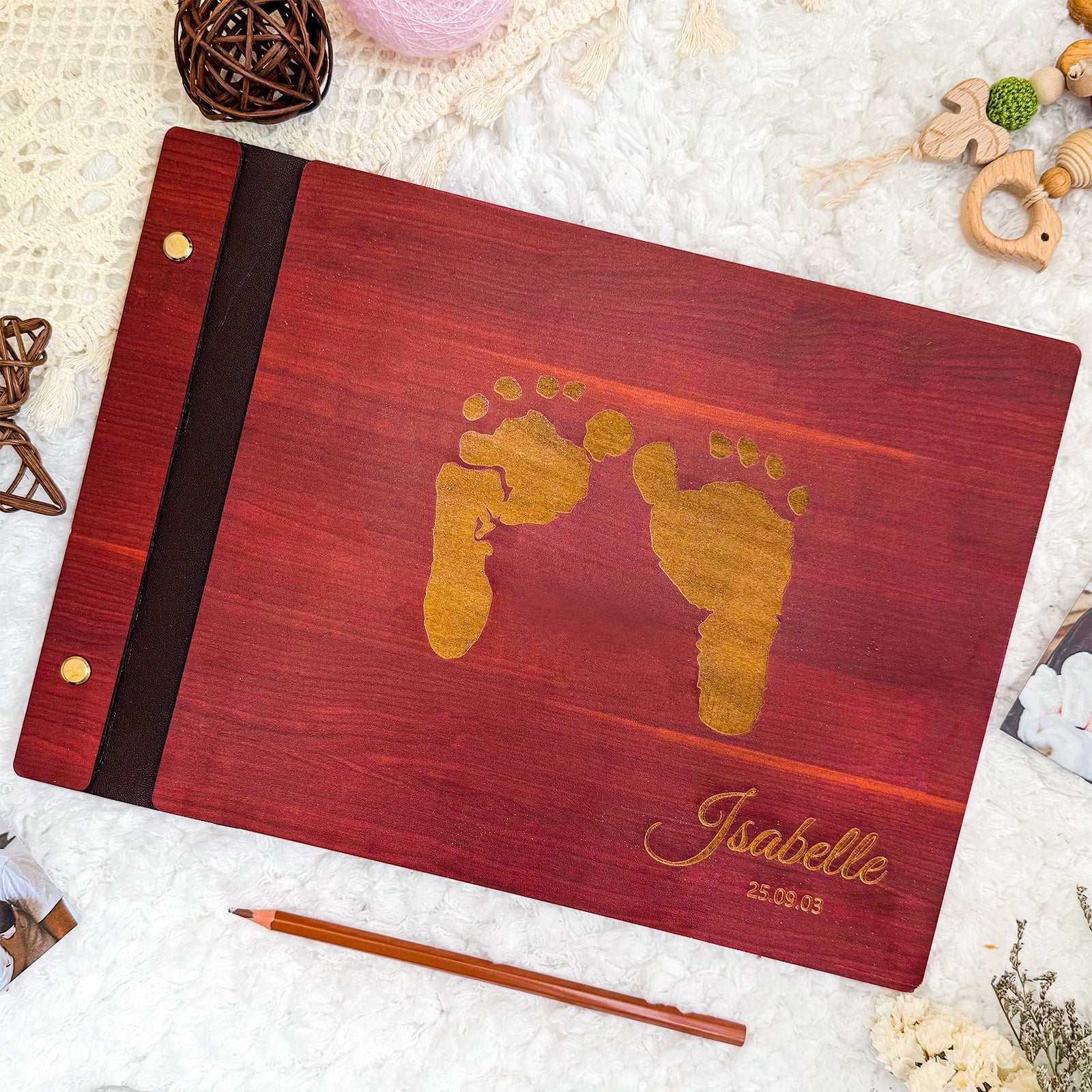 Personalized Baby Photo Album with Name & Birth Date – Wooden Footprint Design