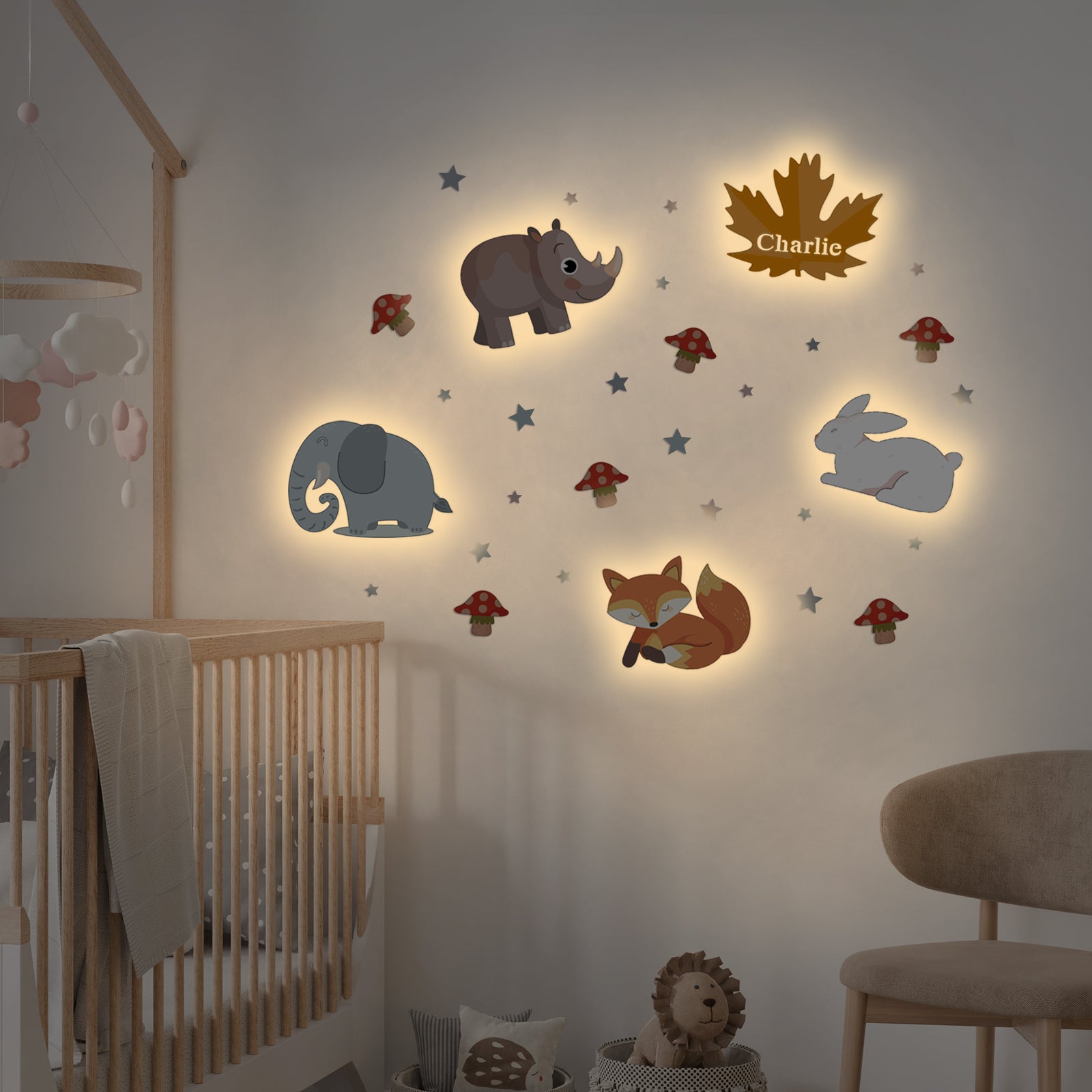 Personalized Wooden Baby's Room Wall Light Set – Forest Animal Theme